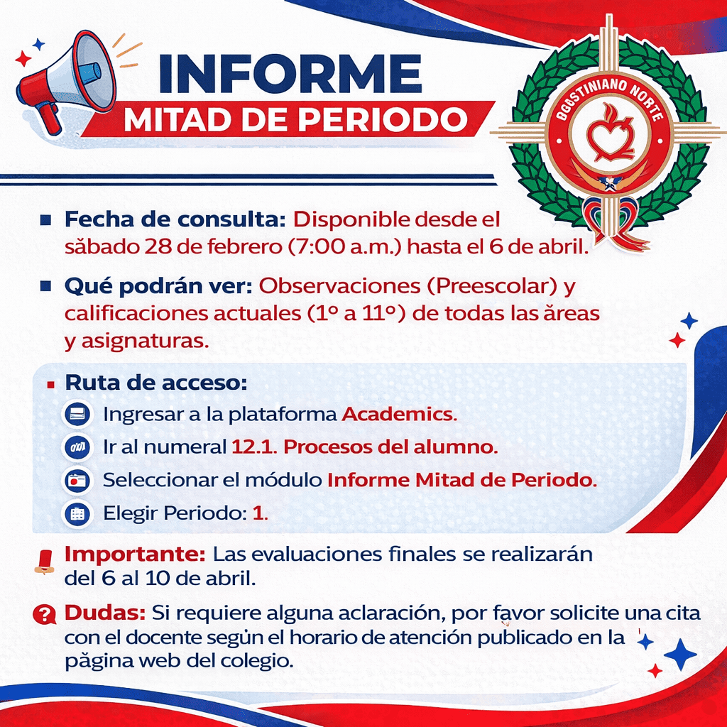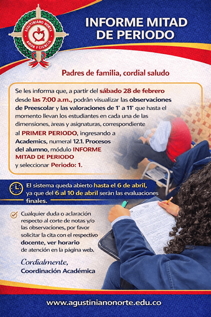 Cualquier duda o aclaración respecto al corte de notas y/o las observaciones, por favor solicitar la cita con el respectivo docente, ver horario de atención en la página web: Horarios de atención – Docentes – Agustiniano Norte