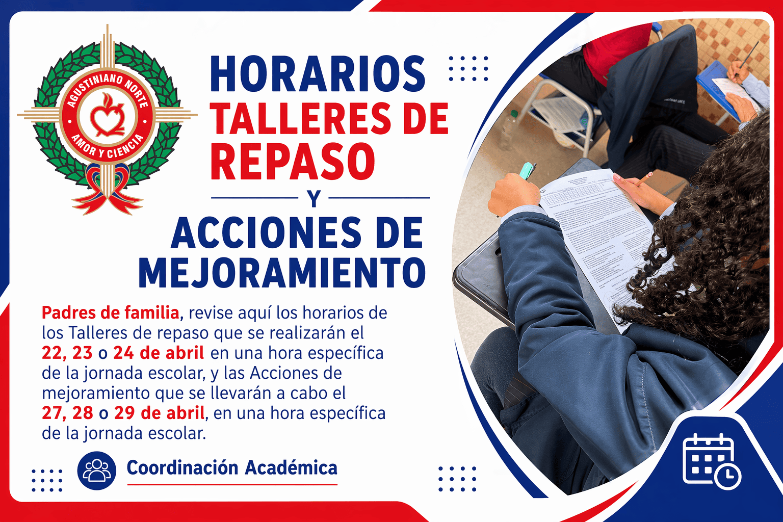 Horarios talleres repaso y acciones de mejoramiento